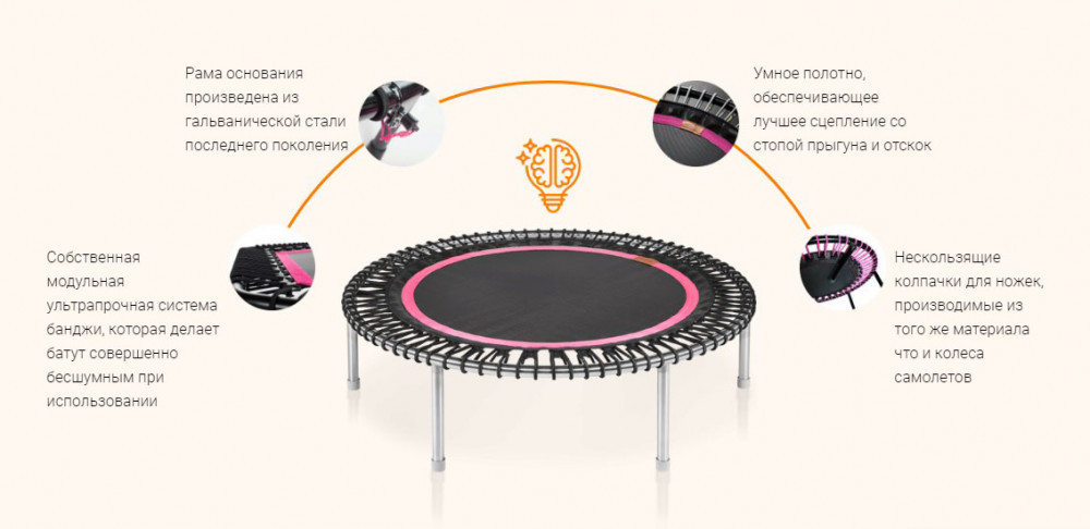- Фирменная модульная ультрапрочная система банджи, которая делает батут совершенно бесшумным при использовании.
