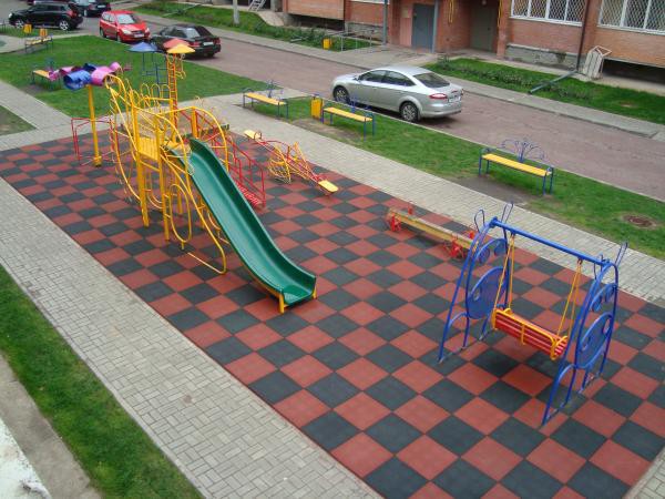 Отличным решением для детских площадок или зон активного отдыха, требующих ударопрочного и травмобезопасного покрытия, станет резиновая плитка. Благодаря уникальным свойствам резины и толщины плитки 4 см сила удара поглощается, и обеспечивается комфортное приземление в случае падения с высоты не более 130 см. Что защитит ребенка от ссадин и травм во время игры на площадке Пористая структура плитки препятствует скапливанию воды на поверхности и образованию наледи. Площадка, оформленная резиновой плиткой, отличается яркостью и долговечностью. Минеральный цветовой пигмент устойчив к выгоранию на солнце, что позволит плитке долго служить без потери привлекательного вида.
