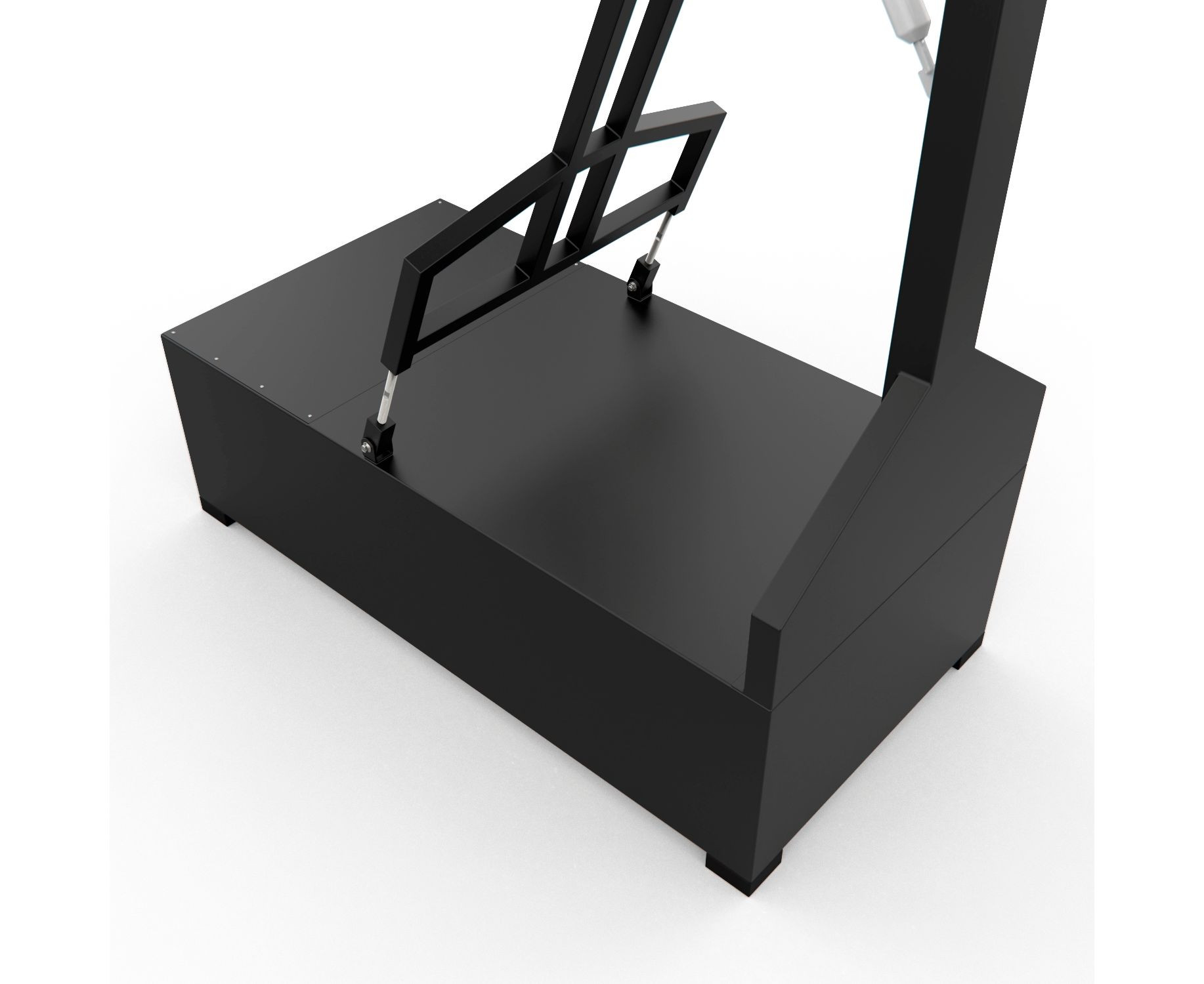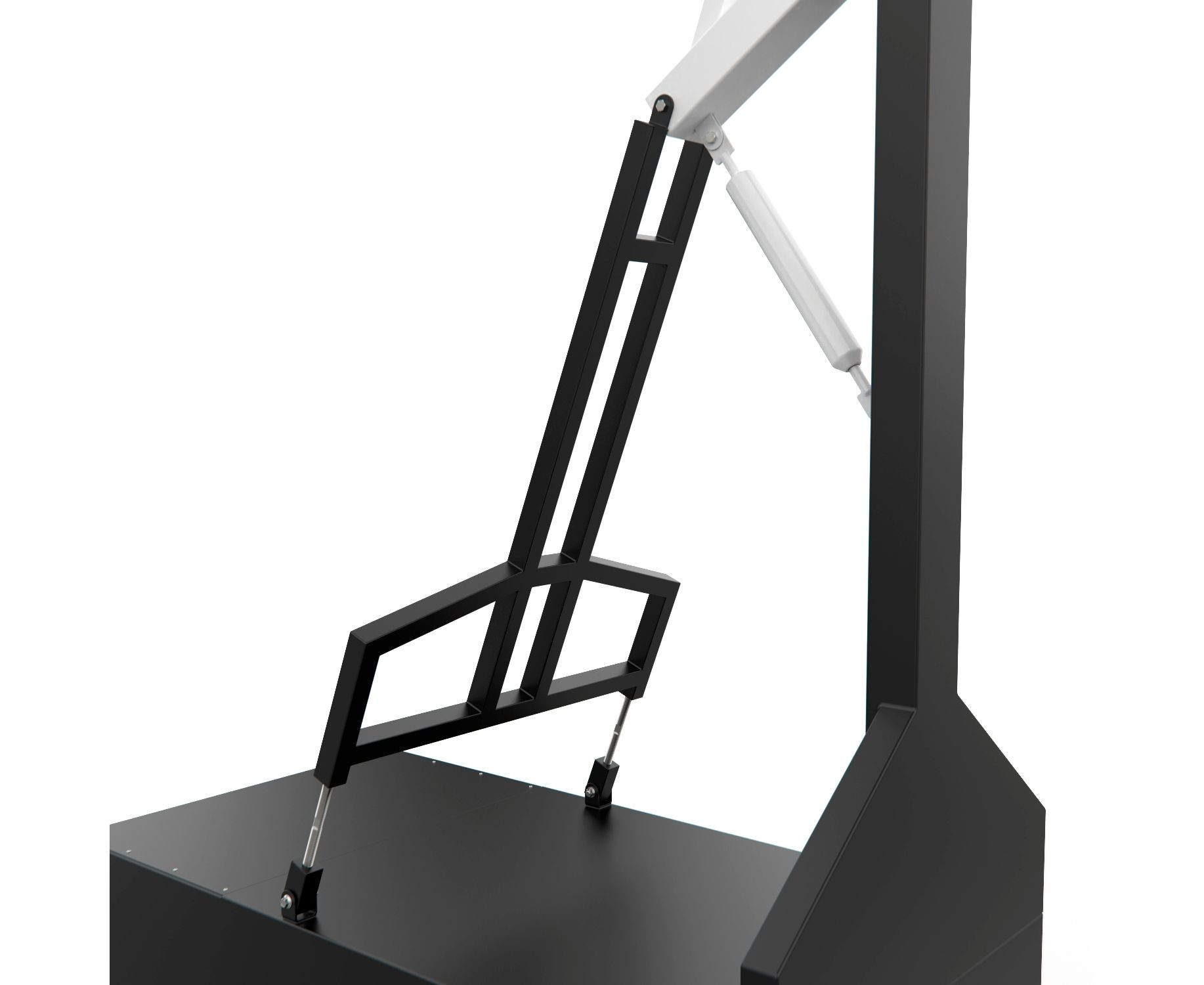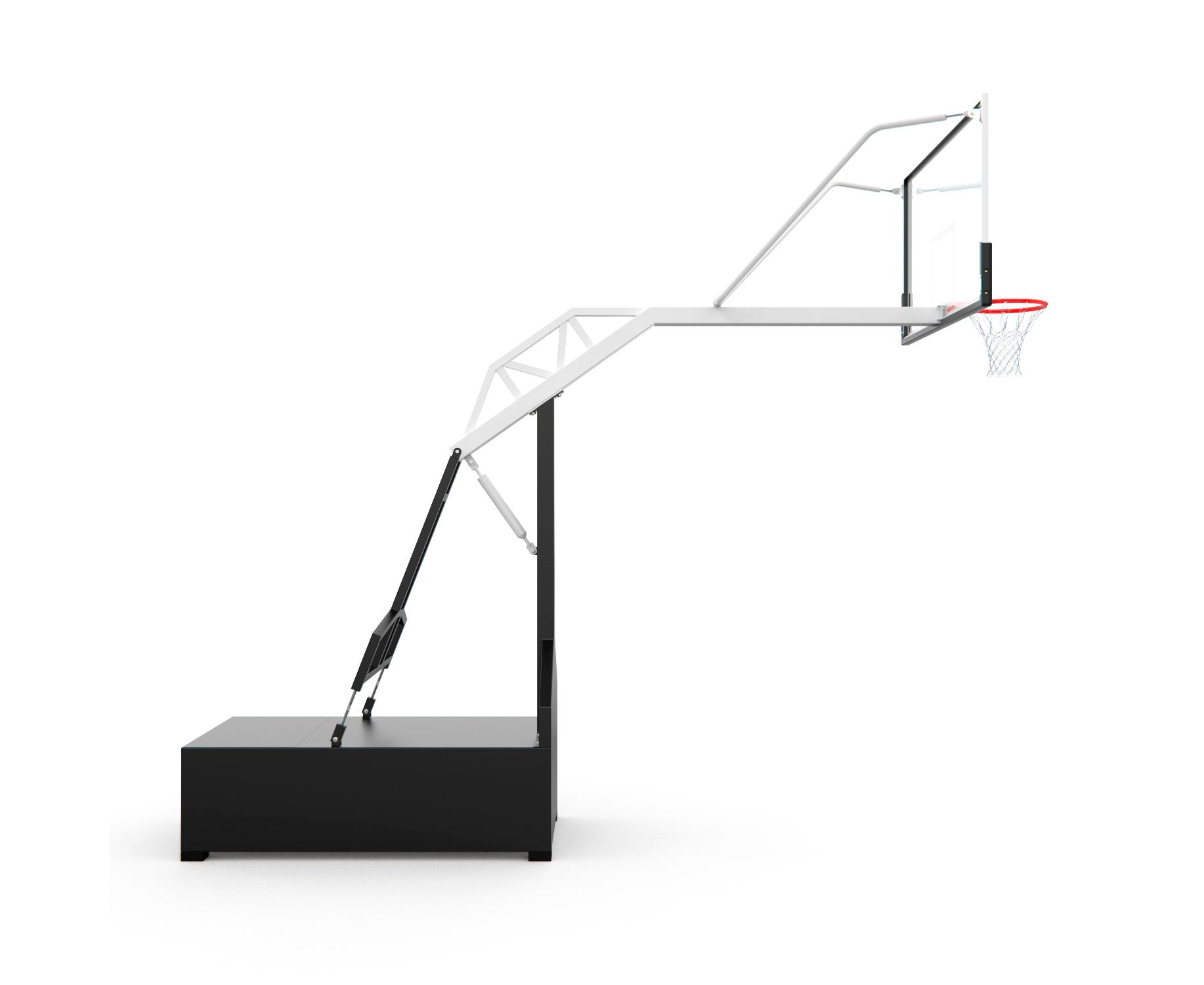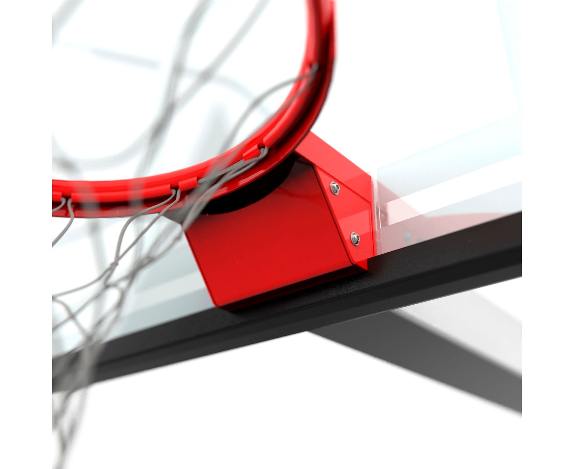 Квадратный столб из нержавеющей стали толщиной 3 мм и размерами 10 x 20 см поддерживает щит. Амортизаторы кольца покрыты защитными кожухами, а нижняя часть стойки покрыта защитными матами. Конструкция весит 300 кг, а в основания дополнительно необходимо заложить утяжелитель весом в 350 кг.