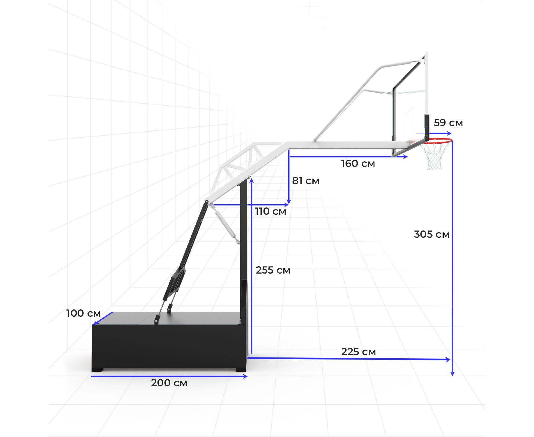 Стойка оснащена регулируемой высотой, что позволяет адаптировать ее под индивидуальные требования пользователя. Размер щита составляет 180х105 см, высота по кольцу – 305 см, вылет щита – 225 см. В комплекте идет кольцо диаметром 45 см и крепление.