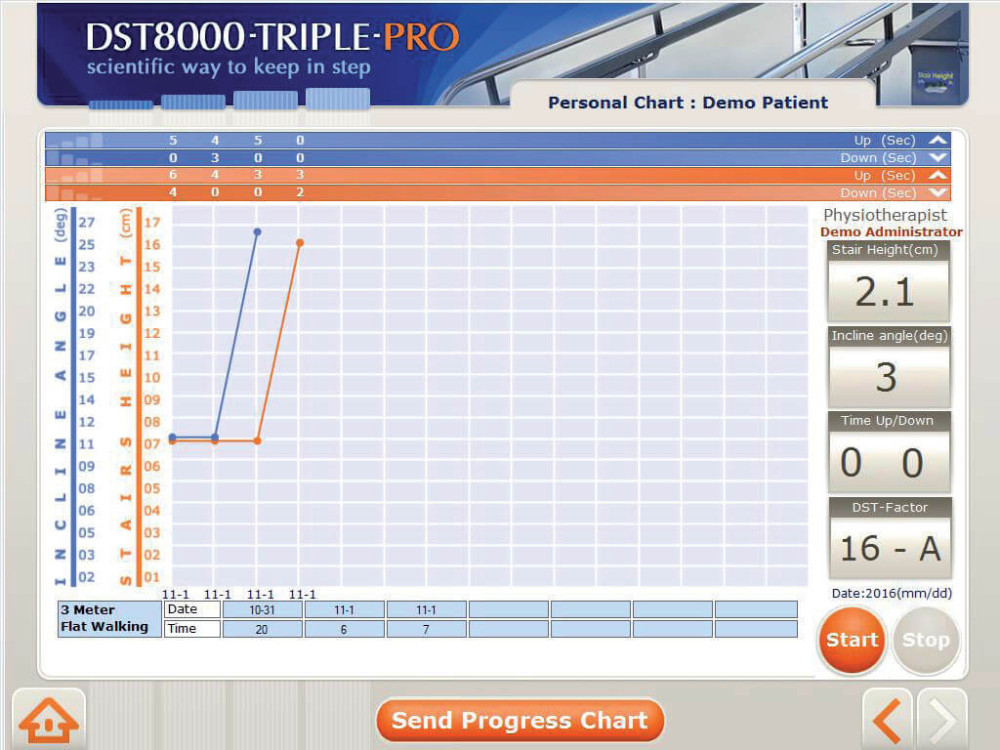 DST 8000 Triple Pro — это понятный и удобный интерфейс для управления программным обеспечением и мониторингом терапии пациента. Тренажер отображает данные предыдущего сеанса, что позволяет отслеживать прогресс пациента. В ходе выполнения упражнений формируются графические показатели прогресса пациента, фиксирующиеся на протяжении всей тренировки. Полученные данные можно скачать или отправить на электронную почту.