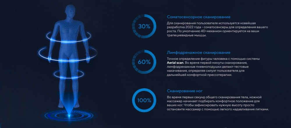 Соматосенсорный 4D-массажный механизм последнего поколения позволяет контролировать положение тела в пространстве и уделяет особое внимание каждой зоне: шейно-воротниковая зона, грудной отдел, плечи и руки, поясница, крестец, ягодицы, икры и стопы.