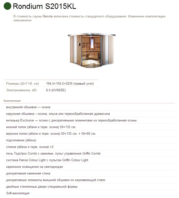 Сауны Rondium фирмы Harvia являются единственными в своем роде. Если при выборе сауны Вы ищете что-то особенное, то эти сауны– Ваш лучший выбор! Эта стильная модель имеет закругленную двойную дверь, декоративный карниз, облицованный нержавеющей сталью и подсветку на светодиодах. Внешние стены, тоже отделанные декоративными элементами из нержавеющей стали, имеют современный внешний вид. В качестве покрытия рамы основания тоже используется нержавеющая сталь, что придает всей сауне стильный облик, при этом защищая от влаги ее нижнюю часть. Внешние панели изготавливаются из термообработанной древесины осины или ольхи, а обшивка потолка и стен внутри сауны выполнена из осины.