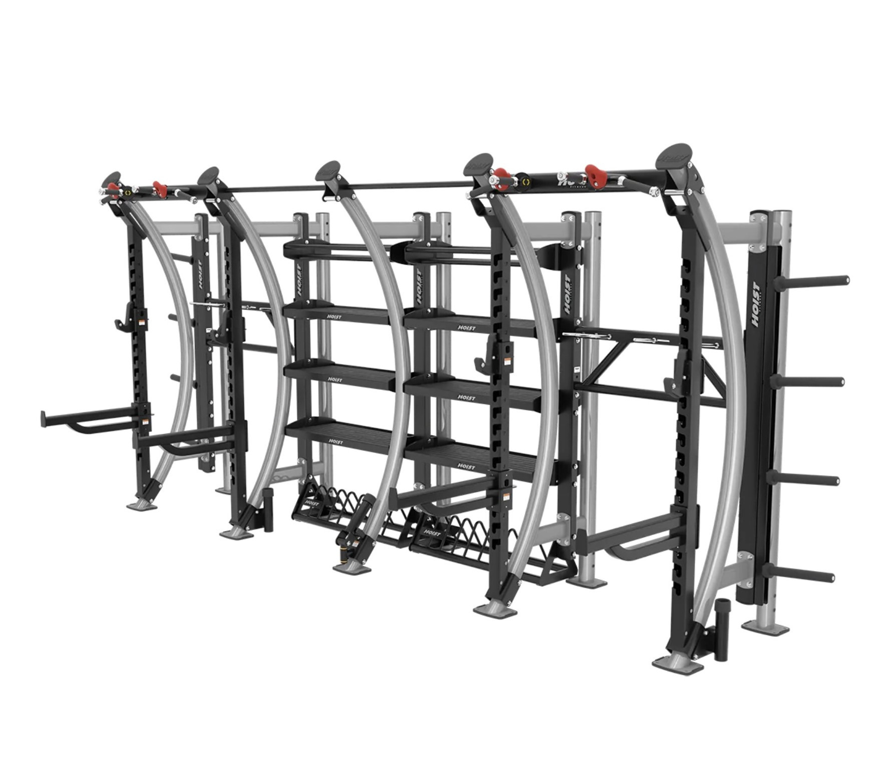 Ультимативная станция «Все-в-одном» от HOIST. Сочетание двух полустоек для жимов и приседов с массивной системой хранения аксессуаров. Идеально для элитных домашних залов и премиальных фитнес-клубов.