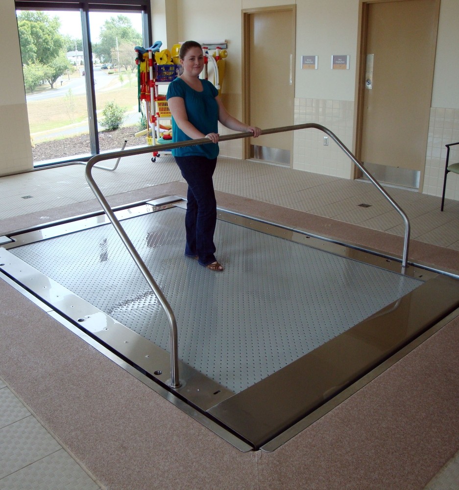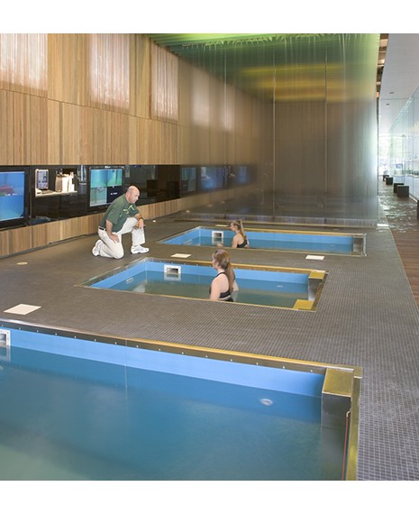 Доступ при нулевой глубине является стандартной опцией оборудования HydroWorx 1200. Пол бассейна можно без труда регулировать по высоте, что позволяет спортсмену стоять или сидеть на подводной беговой дорожке во время погружения дна на нужную глубину. Глубина погружения достигает 182 см за 30 секунд, за счет чего можно разгрузить от 20 до 90% веса пользователя. При этом уровень беговой дорожки в воде повышается или понижается.