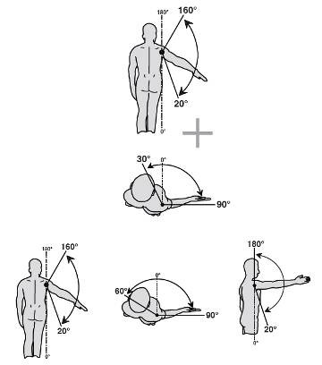 - Отведение/приведение плеча с синхронизированным вращением. Общий диапазон 20°–160°.