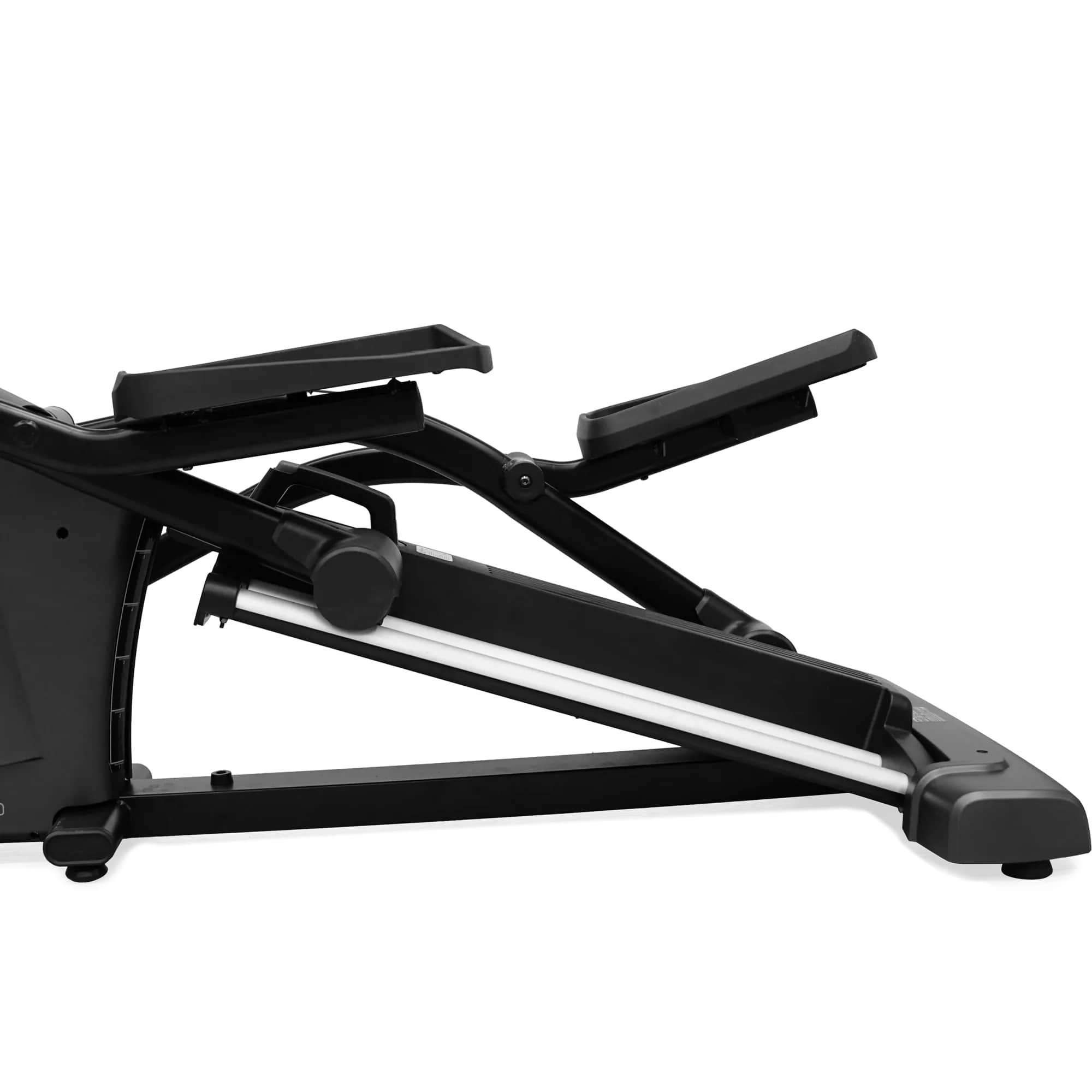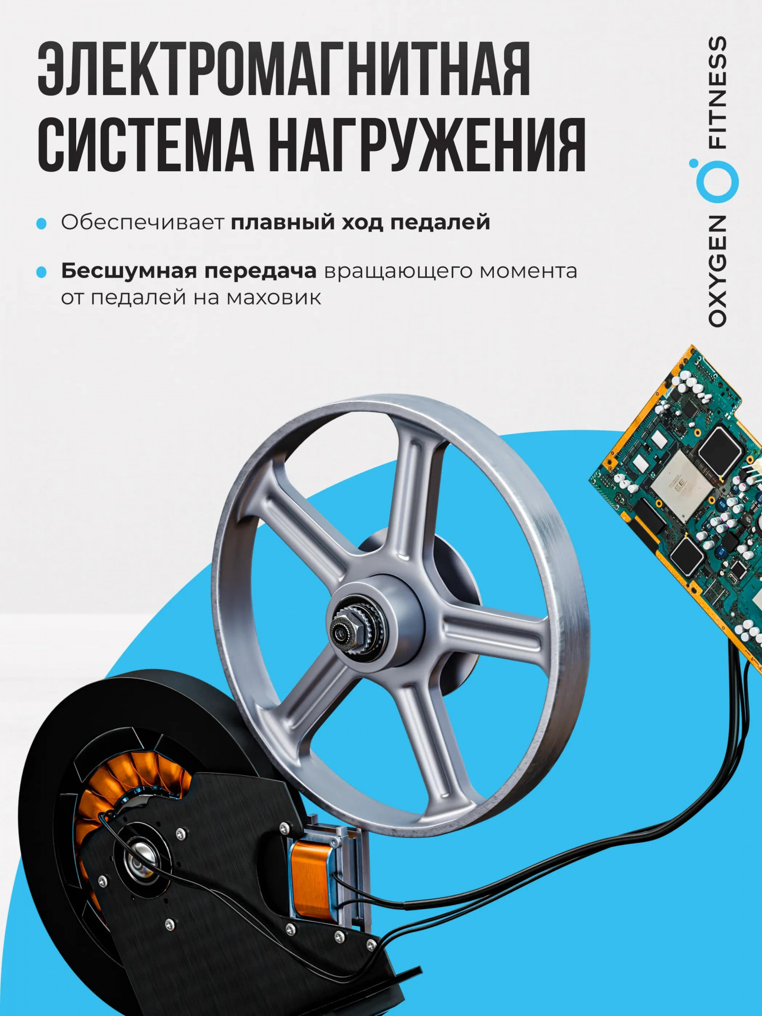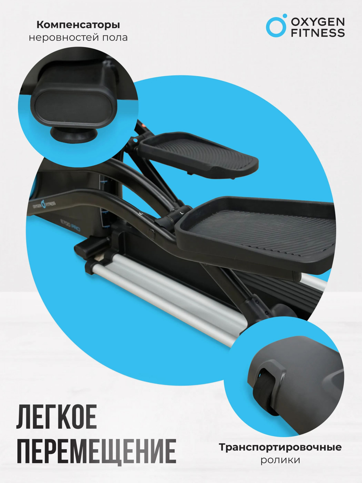 Эллиптический тренажер OXYGEN FITNESS E700 PRO оснащен электромагнитной системой нагружения, регулируемым углом наклона (6 уровней), транспортировочными роликами и компенсацией неровностей пола для удобства использования.
