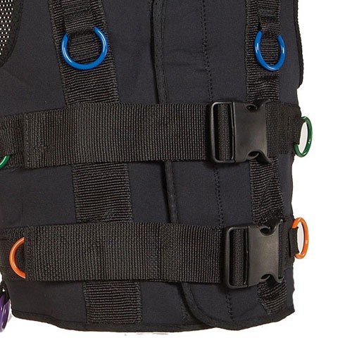- На жилет нашито 12 колец на уровне плеч, груди и талии, которые используются в качестве точек крепления тросов, амортизаторов.