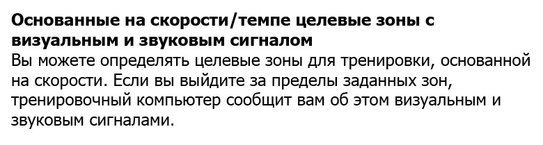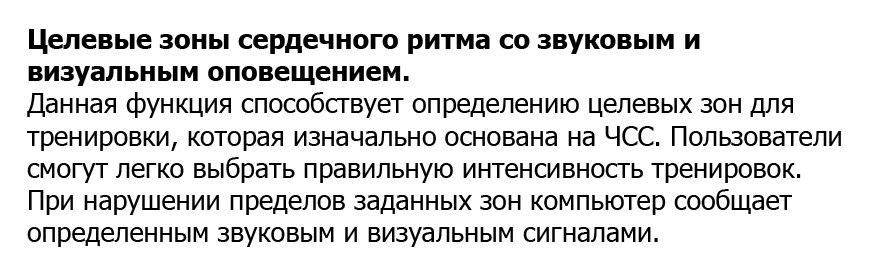 - Целевые зоны сердечного ритма с визуальным и звуковым оповещением.