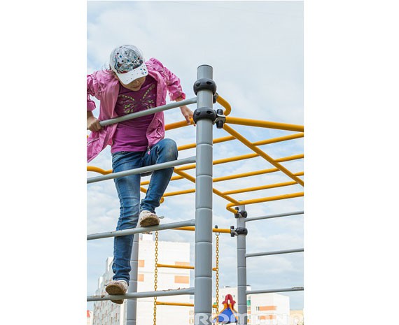Оригинальный спорткомплекс 201.02.00 бренда Romana отлично подходит для установки во дворе или на дачном участке. Стойки из высокопрочных металлических труб, а также кольцевые канавки для установки ограждения. С помощью канавок фиксируют обоймы, состоящие из стальных полухомутов, сверху обшитых пластиком. Полухомуты между собой стягиваются при помощи болтов. В эти обоймы вставляют отводы, к которым крепят ограждения, выполненные из металлических труб.
