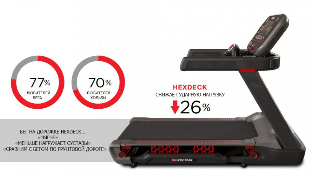 Амортизация беговых дорожек в наше время – это залог комфорта и безопасности. Именно поэтому в новом поколении беговых дорожек Star Trac встроена инновационная запатентованная система HexDeck System, что поглощает удары о беговое полотно. Сделана эта конструкция из алюминиевой деки, поддерживает которую фирменная система подвески, состоящая из полимерных шестигранников.