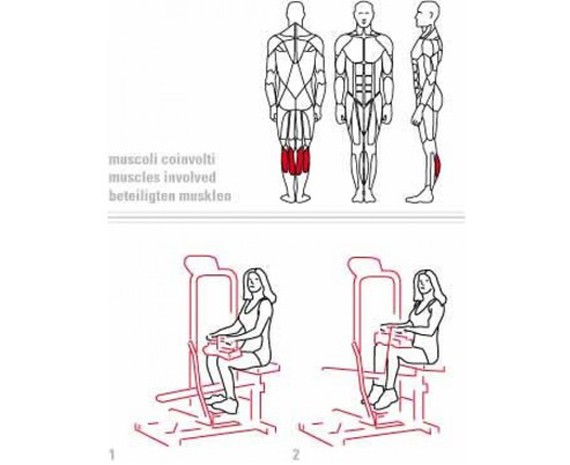 - Силовой тренажер профессионального класса для безопасной и эффективной проработки икроножных мышц с помощью упражнения на разгибание голеностопа в положении сидя.